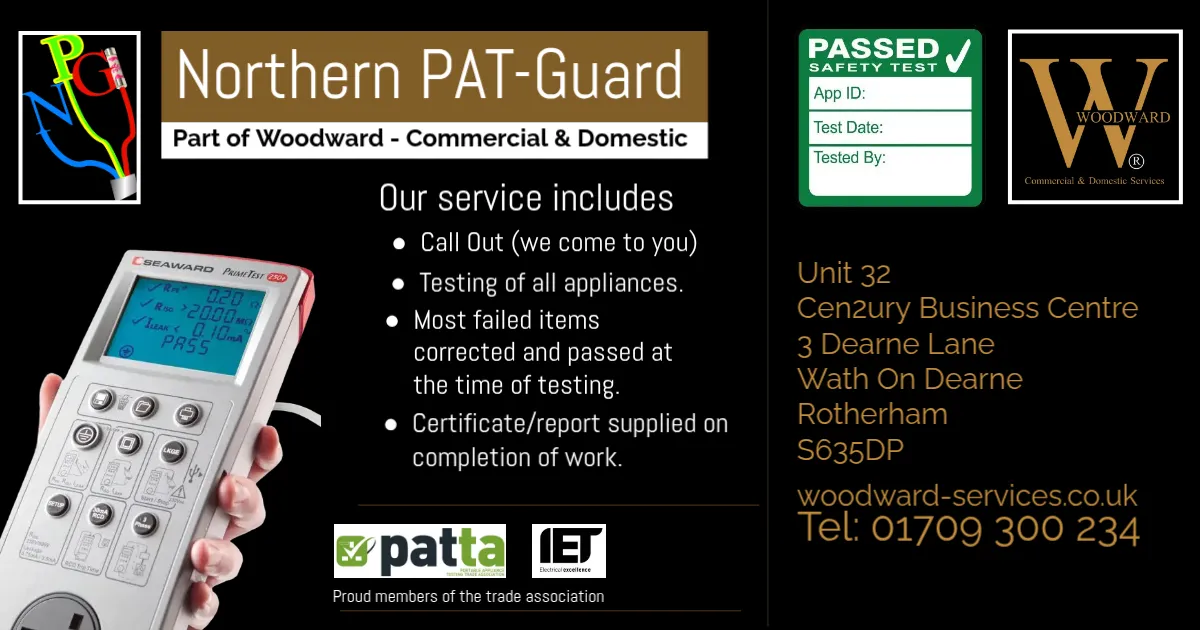 Northern PAT-Guard (Part of Woodward - Commercial & Domestic) We are specialists in electrical safety. The service we provide to our customers is known as PAT testing though we like to simply say PAT. Why? you might ask. The T in PAT stands for testing so why would we say PAT testing? Portable Appliance Testing is the way many businesses ensure their workforce is safe from electrical harm by ensuring their appliances are safe to use. We do this on a regular basis, for many it is annually though some companies require our services more often than this.