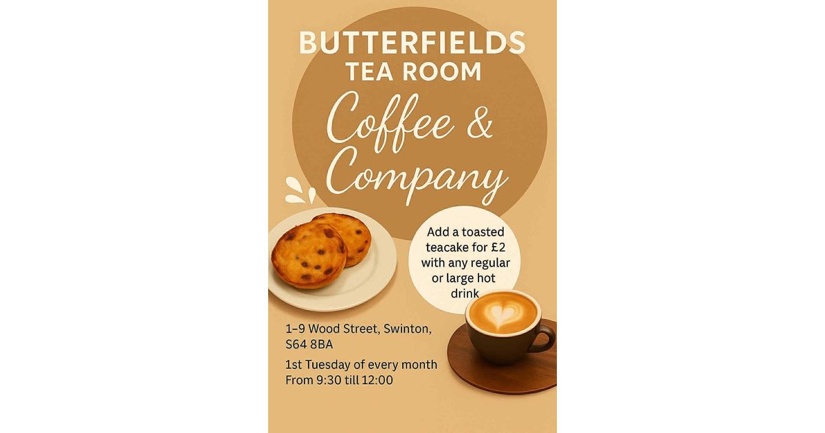Butterfields Tea Room invites you to 'Coffee & Company', a recurring social event held on the first Tuesday of every month. Enjoy a cozy atmosphere, add a toasted teacake for £2 with any regular or large hot drink, and make new friends.