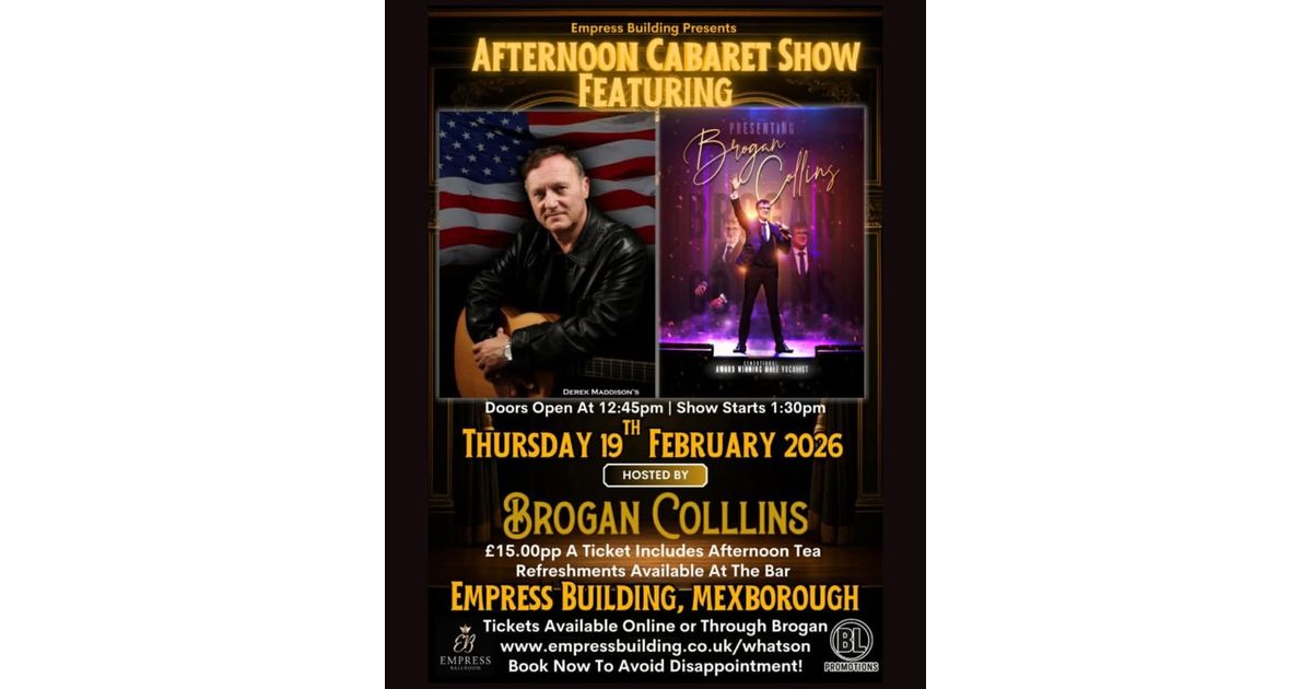 Enjoy an exciting afternoon cabaret show starring Brogan Collins, hosted at the Empress Building in Mexborough. The event, scheduled on Thursday, 19th February 2026, promises an entertaining experience with a ticket price that includes delightful afternoon tea. Refreshments are available at the bar, ensuring a complete afternoon of enjoyment. Don't miss out on this wonderful event.