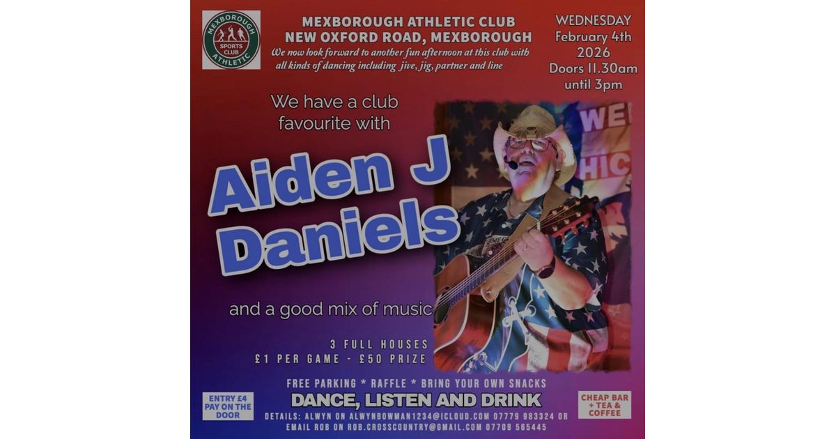 Join the fun at Mexborough Athletic Club on New Oxford Road for an entertaining afternoon with Aiden J Daniels. Enjoy a lively mix of music styles, including jive, jig, partner, and line dancing. With free parking, a raffle, and the option to bring your snacks, the event promises a vibrant atmosphere for dancing, listening, and drinking.