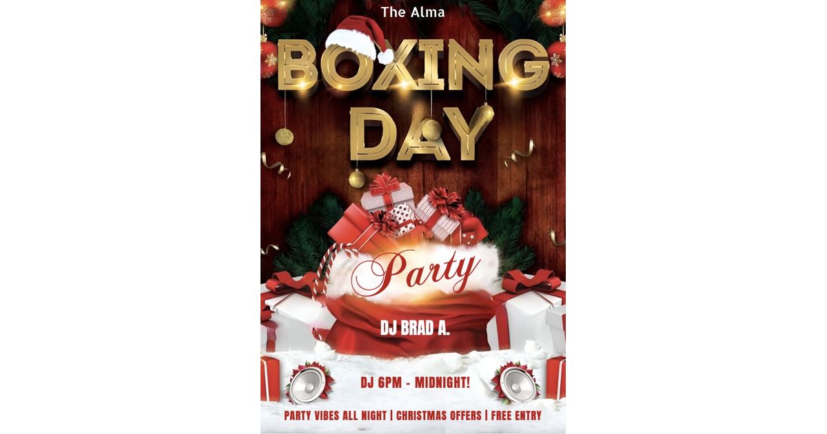 Celebrate Boxing Day at The Alma with an exciting party featuring DJ Brad A. Enjoy party vibes all night long and exclusive Christmas offers. Free entry ensures a fun night for everyone. Join us for an unforgettable Boxing Day celebration!