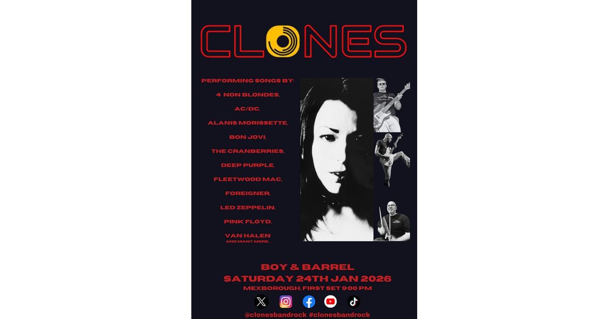 Experience Clones performing songs by iconic bands like 4 Non Blondes, AC/DC, Alanis Morissette, Bon Jovi, The Cranberries, Deep Purple, Fleetwood Mac, Foreigner, Led Zeppelin, Pink Floyd, Van Halen, and many more in Mexborough. Don't miss their first set at 9:00 PM.