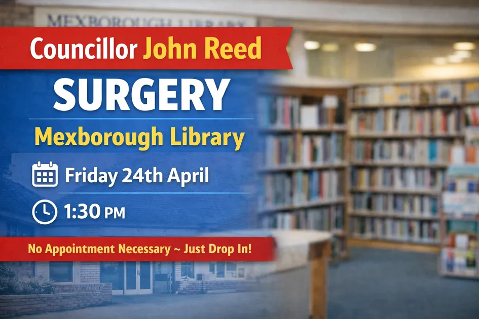 Join Councillor John Reed at Mexborough Library for an open surgery on Friday, 24th April at 1:30 PM. No appointment is necessary—just drop in and discuss your concerns or questions directly.