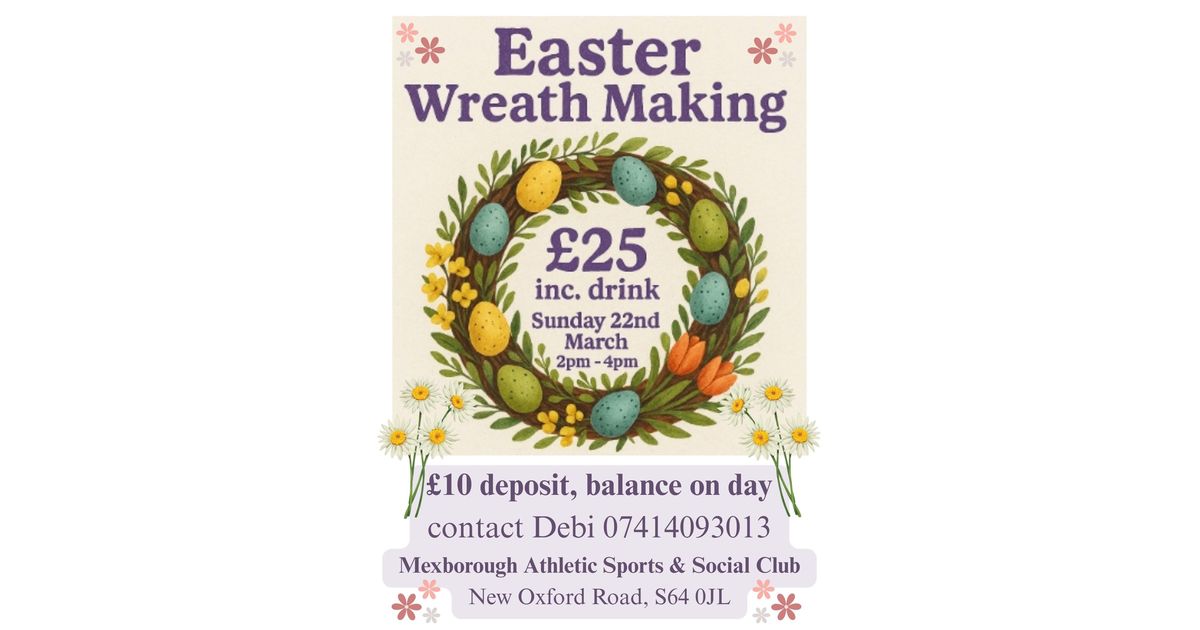 Join us for a creative Easter Wreath Making session at the Mexborough Athletic Sports & Social Club, New Oxford Road. This event, ideal for craft enthusiasts, includes all materials and a drink for £25. Reserve your spot with a £10 deposit and enjoy a fun afternoon on March 22nd.
