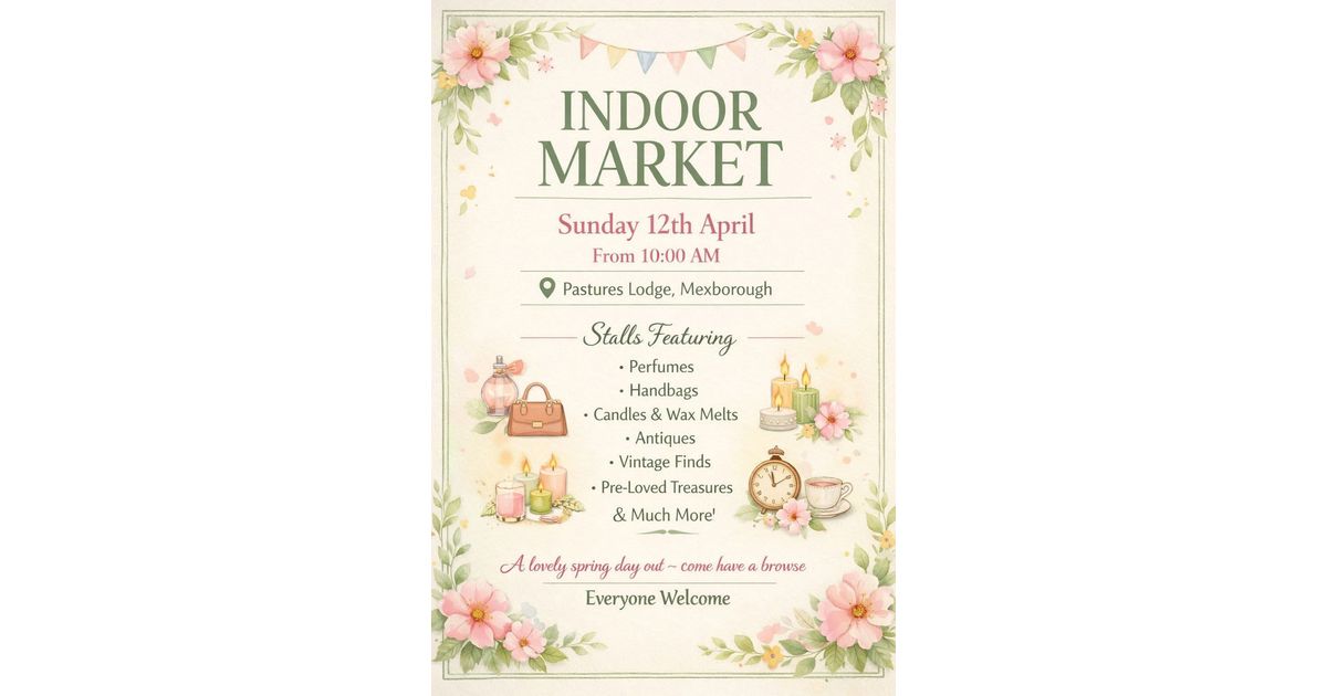 Visit the Indoor Market at Pastures Lodge in Mexborough on Sunday, 12th April, starting at 10:00 AM. Discover a variety of stalls featuring perfumes, handbags, candles and wax melts, antiques, vintage finds, pre-loved treasures, and much more. Enjoy a delightful spring day out and explore the offerings at this welcoming community event.