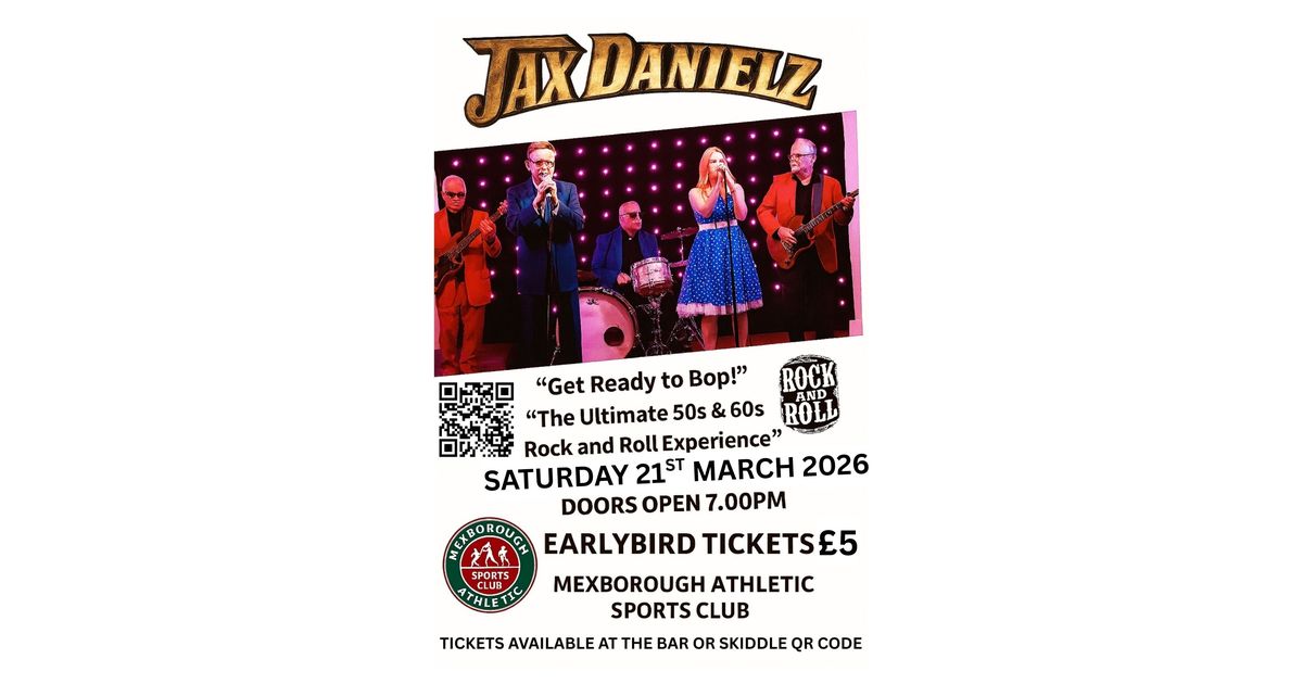 Experience the ultimate 50s and 60s rock and roll at the Jax Danielz event on 21st March 2026. Held at Mexborough Athletic Sports Club, this is a musical blast from the past featuring lively performances. Tickets available at the bar or through a Skiddle QR code.