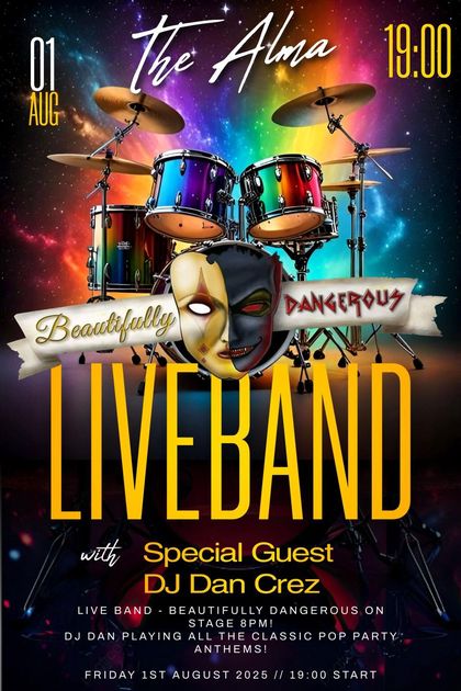 The Alma presents a thrilling live band event featuring 'Beautifully Dangerous' with a special guest appearance by DJ Dan Crez. The event kicks off at 7 PM with live performances and DJ Dan playing all the classic pop party anthems from 8 PM onwards. Guests can enjoy a lively musical evening in a vibrant setting.