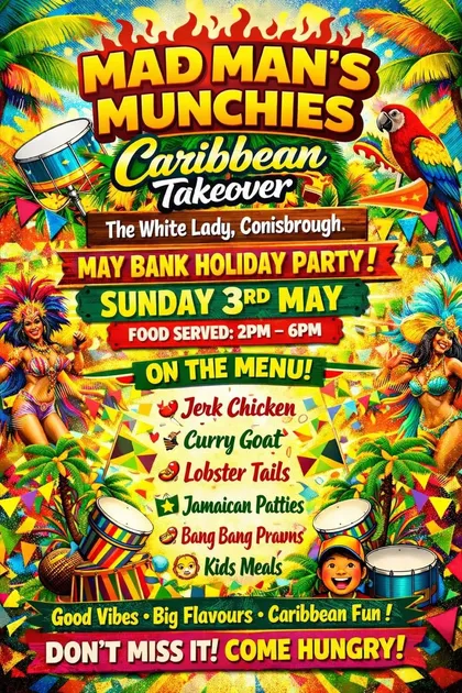Join Mad Man's Munchies for a vibrant Caribbean Takeover at The White Lady in Conisbrough. Celebrate the May Bank Holiday on Sunday, 3rd May with delicious Caribbean dishes like jerk chicken, curry goat, lobster tails, Jamaican patties, bang bang prawns, and kids meals. Enjoy the good vibes, big flavours, and lively Caribbean fun. Don't miss it and come hungry!