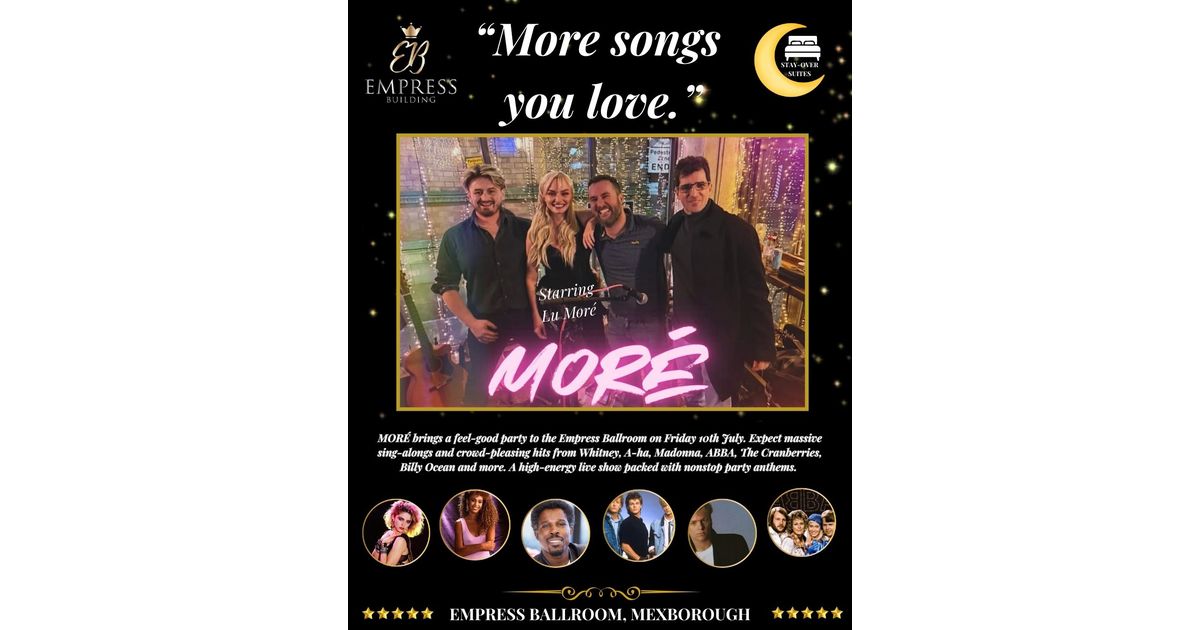 Get ready for a proper Friday night party as Doncaster’s very own MORÉ take over the Empress Ballroom — starring the sensational Lu MORÉ.