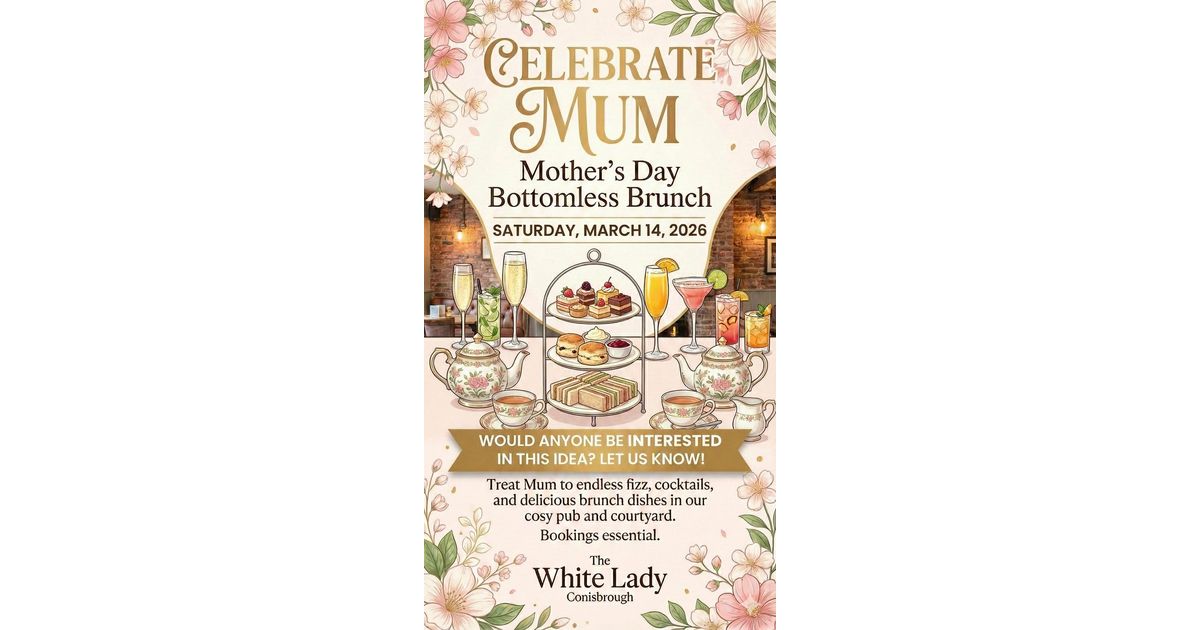 Celebrate Mum with a special Mother's Day Bottomless Brunch at The White Lady in Conisbrough. Enjoy endless fizz, cocktails, and delicious brunch dishes in a cosy pub and courtyard setting. Perfect for treating your mum to a delightful day out. Bookings are essential.