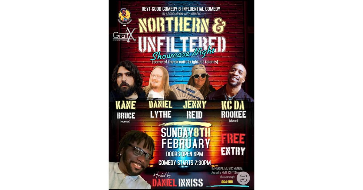 Northern & Unfiltered Showcase Night features some of the circuit's brightest comedy talents including Kane Bruce, Daniel Lythe, Jenny Reid, and KC Da Rookee. The event promises an evening filled with laughter and entertainment, hosted by Daniel Inniss. Doors open at 6 PM with the comedy starting at 7:30 PM. Located at the Imperial Music Venue in Mexborough, this event offers a great night out with free entry.