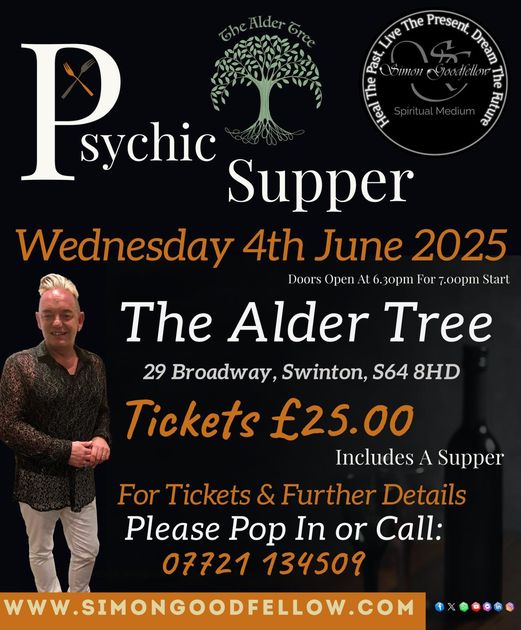Join a special Psychic Supper event at The Alder Tree in Swinton. The event offers an engaging evening with a spiritual medium, starting with doors opening at 6:30 PM. Tickets are priced at £25, which includes a supper. For more details, visitors are encouraged to pop in or call the provided phone number.