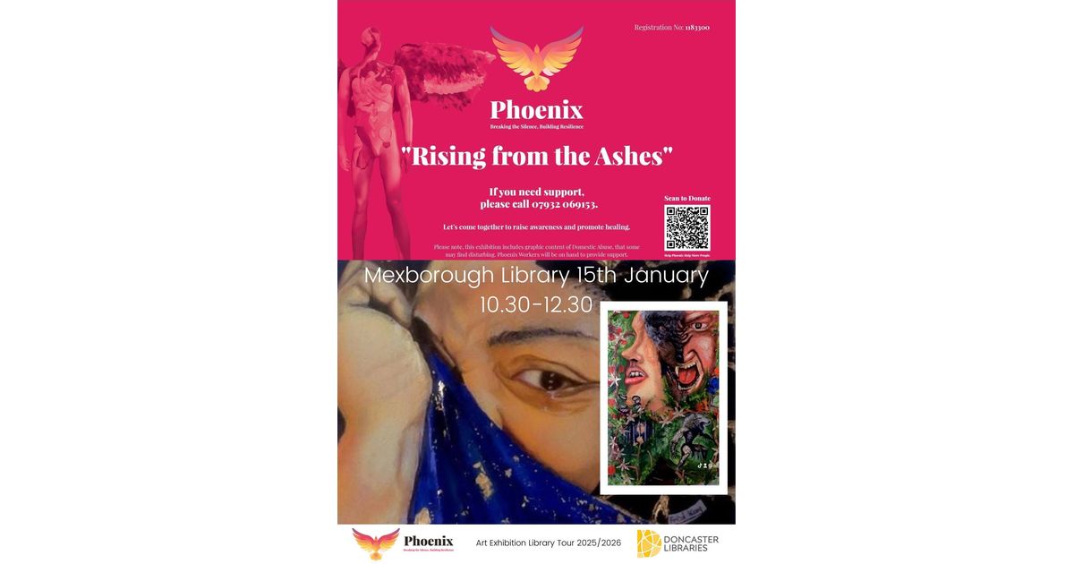 Join Phoenix at Mexborough Library for 'Rising from the Ashes,' an inspiring art exhibition part of the Art Exhibition Library Tour 2025/2026. This event aims to raise awareness and promote healing, featuring graphic content of an sensitive nature. Phoenix Workers will be on hand to provide support. Free entry, donations welcome.