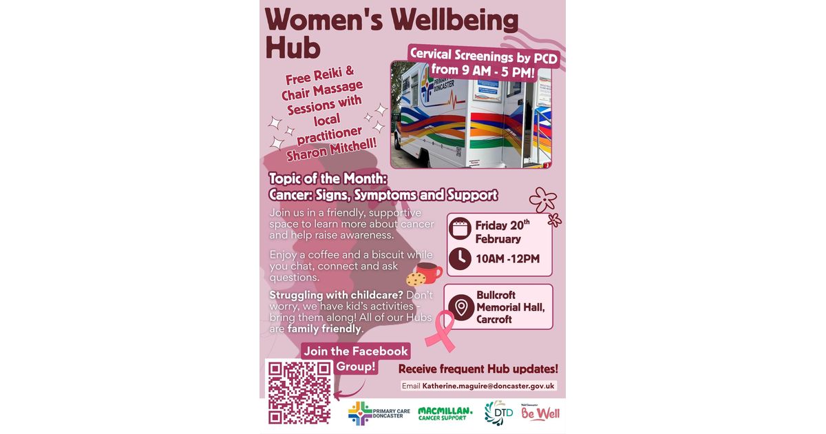 Join the Women's Wellbeing Hub for a friendly, supportive session focusing on cancer awareness. Learn about signs, symptoms, and support while enjoying a coffee and biscuit. This event is family-friendly with activities for kids. Free reiki and chair massage sessions with local practitioner Sharon Mitchell will also be available. Don't miss this opportunity to chat, connect, and ask questions about cancer.